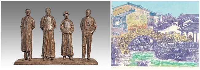 “摘星辰”·李凤志 《建筑四杰》雕塑、“看山河”·丁奕 《焦溪古镇》版画